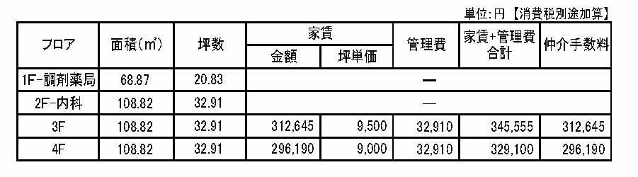 | 賃料 | 3F 312,645円(坪9500円)/4F 296,190円(坪9,000円) |